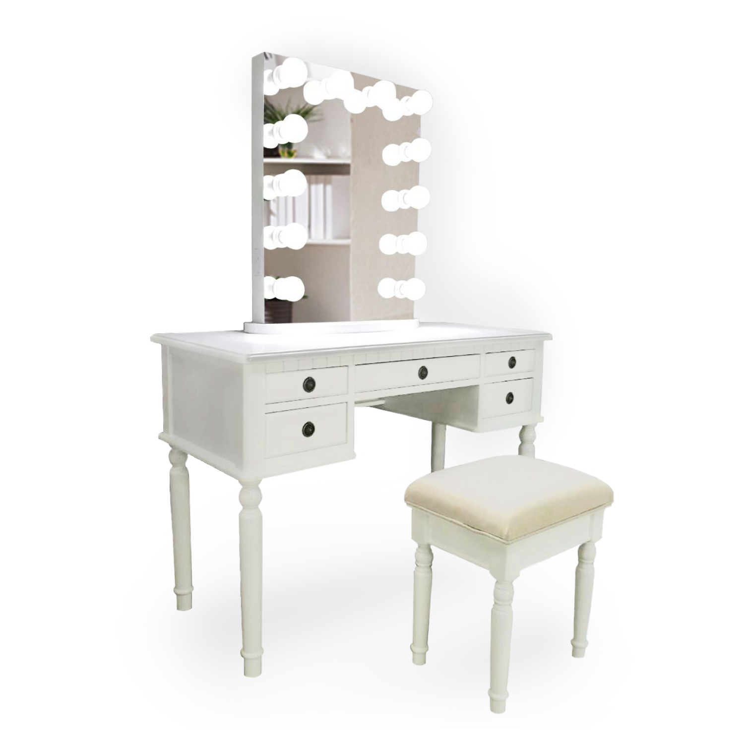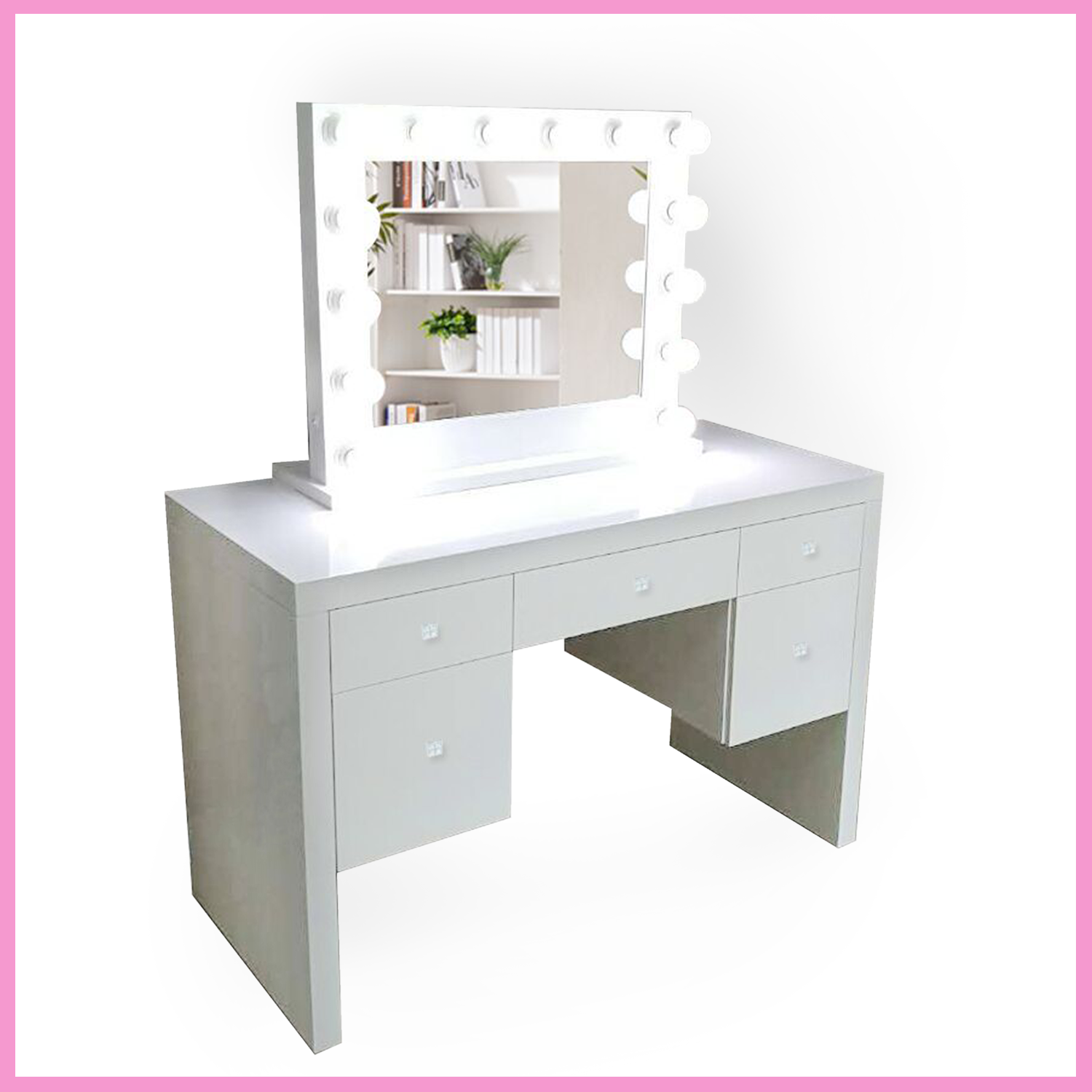 Glam Mirrors uses only the highest quality, distortion-free mirrors. The Monroe Glam Mirror is lined with 14 custom bulbs (with a lifespan of 50,000 hours) to ensure lifelike, accurate color representation. Measured by the Color Rendering Index, Glam Mirrors use bulbs exceeding 90 for professional results.