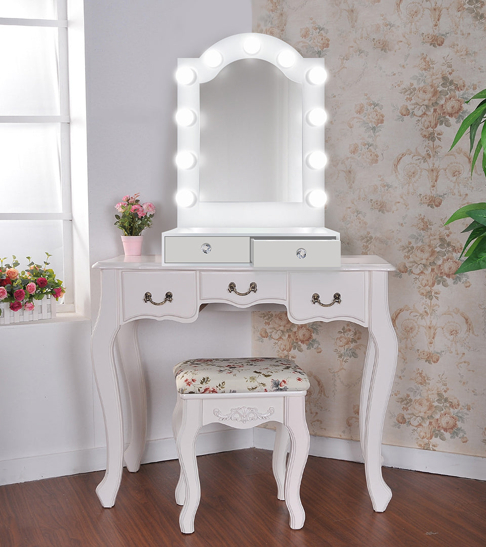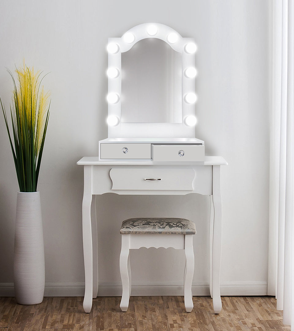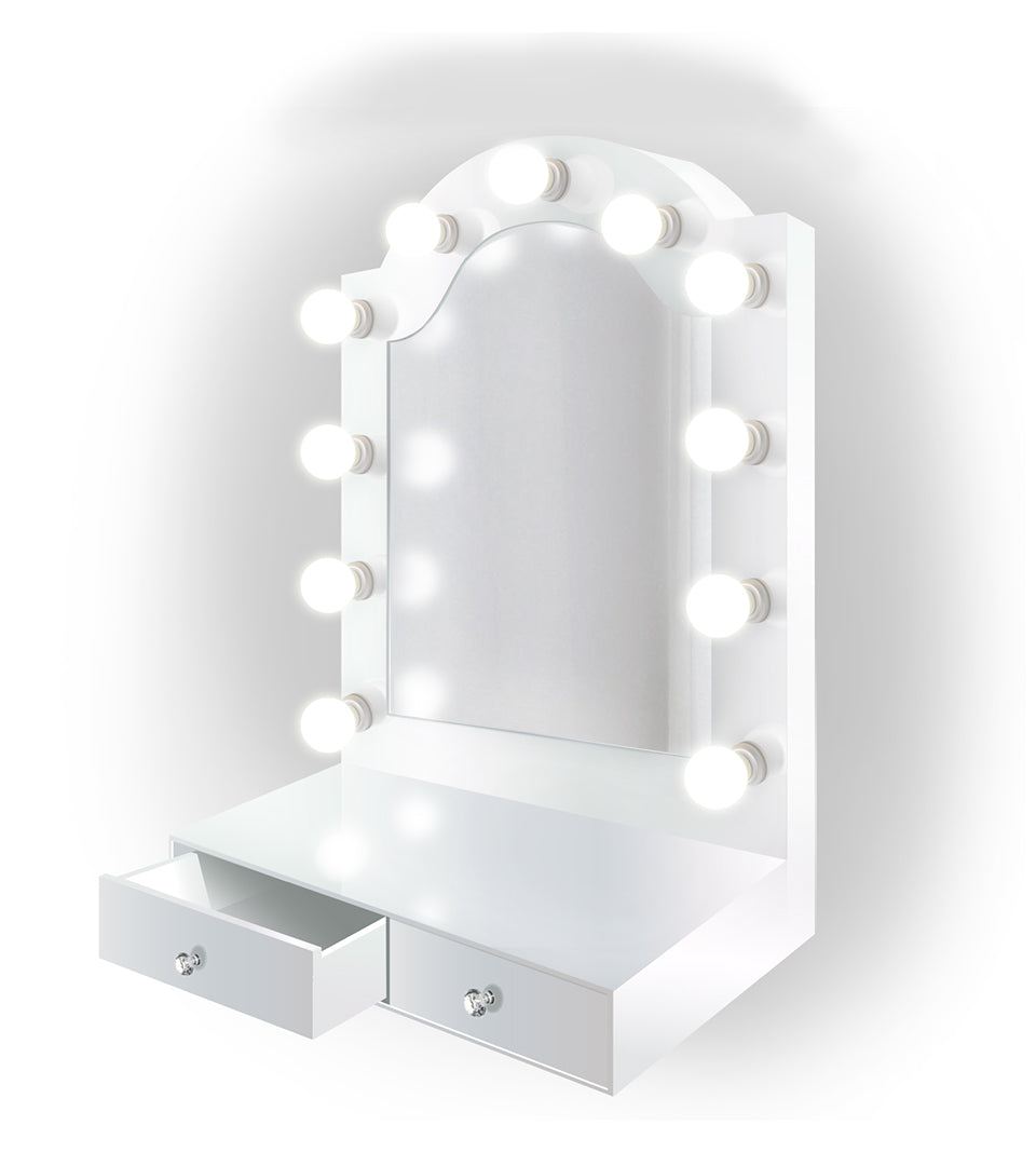 Inspired by the legendry horseshoe arches of grand Moorish Revival theatres, the Alhambra Hollywood Mirror is a seamless way to transform any table at home into a glamorous makeup vanity. The iconic architectural shape is a natural fit for our mirror, intelligently framing the contours of the face and crown.. Two drawers featuring crystal pulls serve as storage for your makeup essentials. Like our larger units, the integrated outlet keeps heated tools like hairdryers, straighteners, and curlers powered at hand. Atop the drawers is a gloss white workspace, an ideal surface for concealers and creams, easily wiped clean after use. Enjoy the mystique of Southern Spain without having to stamp your passport.