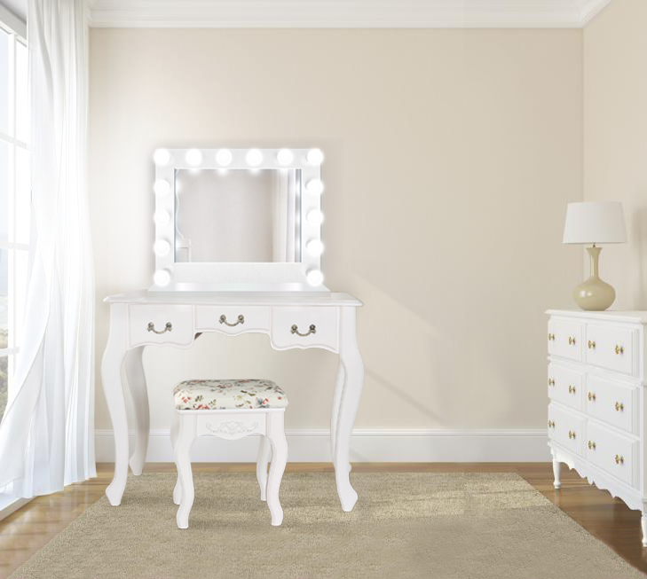 We brought some South Beach sizzle and whitewashed art deco to the Contessa Glam Mirror. The framed border sets this Hollywood mirror apart, reminiscent of classic hotel marquees just off the beach. Clean lines extend all the way to the base; place on the makeup table of your choice or hang directly on the wall. An integrated outlet keeps heated tools close when you need to transition styles from day to night. It’s as essential as suntan lotion and your favorite bathing suit.