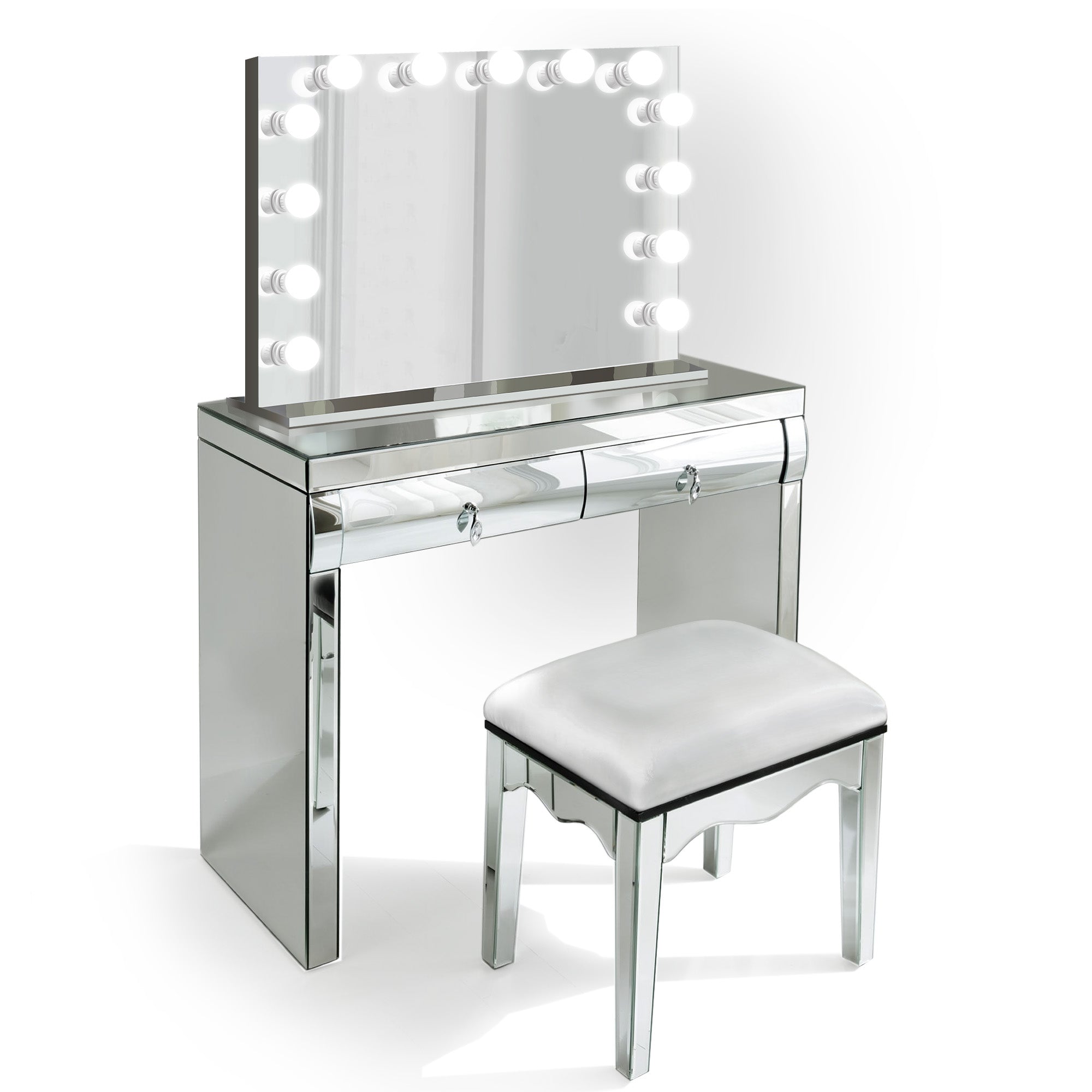 39" Glam Mirrored Makeup Vanity Set Includes Glam Hollywood Mirror + Chair + Makeup Table with Two Drawers